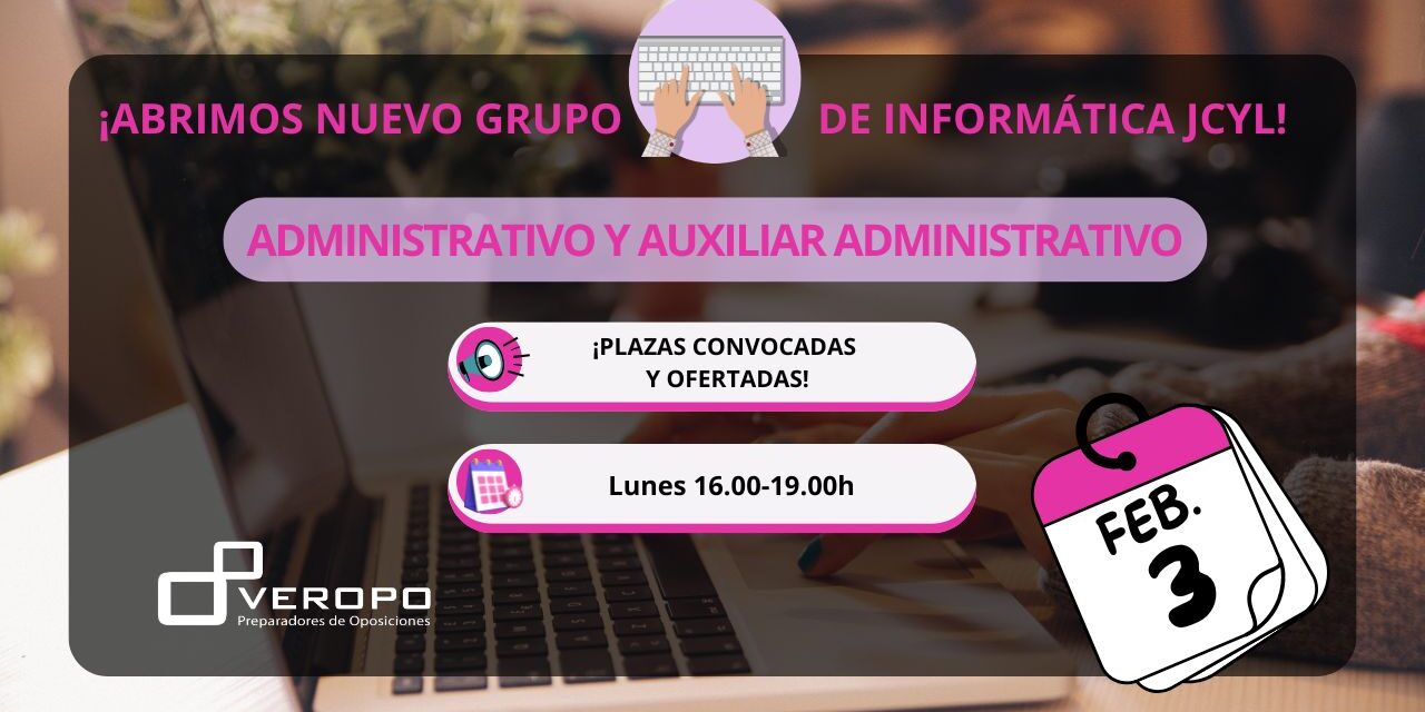¿Aún no estás preparando la informática de la JCYL? Bien sea para conseguir plaza como Auxiliar Administrativo o como Administrativo del la JCYL…¡Necesitas este grupo! Nuestra experiencia en ambas oposiciones nos ha dejado bien claro que llevar bien preparada la informática es lo que marca la diferencia para conseguir la plaza. ¡Aprovecha la oportunidad de comenzar con este grupo nuevo el lunes 3 de febrero! ¡Vamos con los detalles!