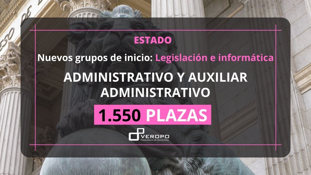 Prepara la legislación y la informática de Administrativo y Auxiliar Administrativo de Estado desde ya para la próxima Convocatoria 1.550 son las plazas que suman las pendientes de Convocatoria de Auxiliar Administrativo de Estado y Administrativo Estado. Concretamente, son 550 las ofertadas de Auxiliar y 1.000 las de Administrativo. En Veropo te lo ponemos fácil…