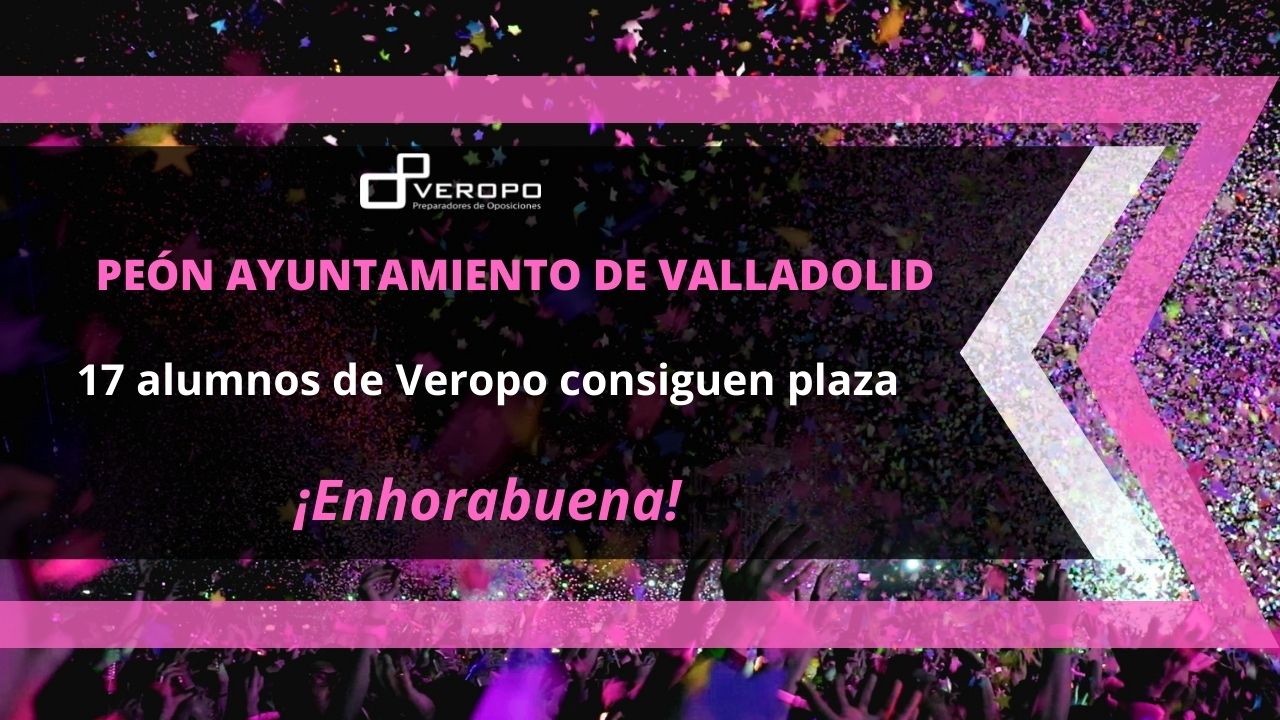 Un total de 17 alumnos de Veropo consiguen su plaza como Peón del Ayuntamiento de Valladolid  ¡Novedades en el proceso selectivo de Peón del Ayuntamiento de Valladolid! Tras la revisión que tuvo lugar el pasado 5 de noviembre se ha publicado el listado definitivo de aspirantes que han superado el proceso selectivo de Peón del…