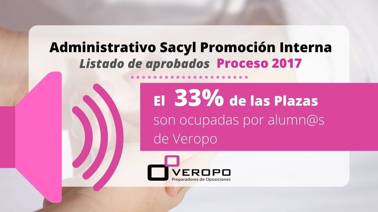 El 33% de las plazas de Administrativo Sacyl por promoción interna han sido ocupadas por alumnos de Veropo La Consejería de Sanidad ha publicado esta mañana la relación de aspirantes que han superado el proceso selectivo 2017 de Administrativo Sacyl por promoción interna. ¿Quieres saber si eres uno de los afortunados? ¡Sigue leyendo! PLAZAS CONVOCADAS…