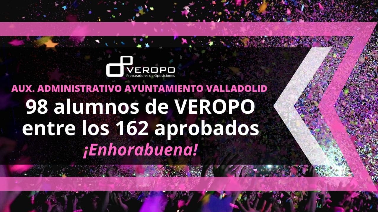 98 alumnos de Veropo entre los 162 aprobados del primer ejercicio del Ayuntamiento de Valladolid ¿Te presentaste al primer ejercicio de Auxiliar Administrativo del Ayuntamiento de Valladolid? Pues atento porque han publicado la lista de aprobados y tenemos la información. Si quieres saber si eres uno de los afortunados, ¡sigue leyendo! PLAZAS CONVOCADAS Turno Libre…