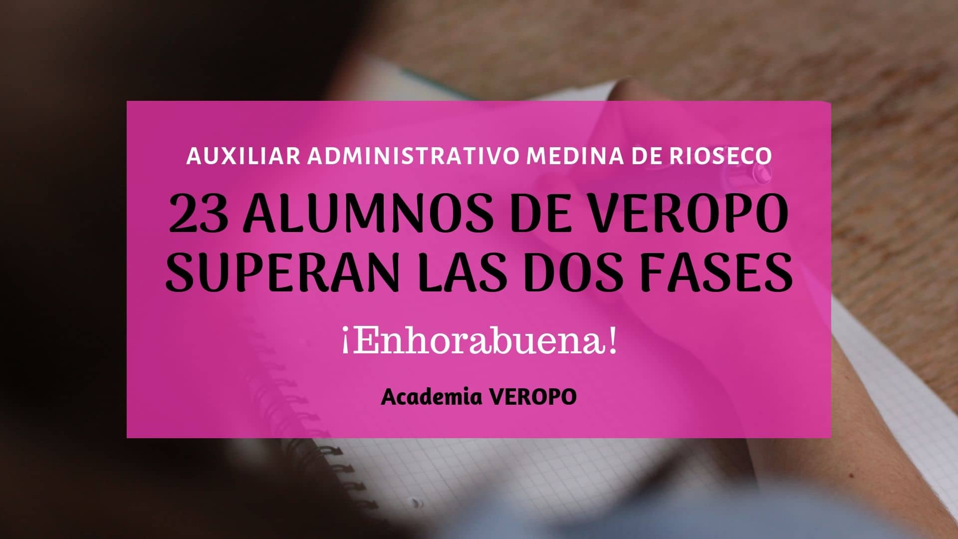 23 alumnos de VEROPO han superado las dos fases de Auxiliar Administrativo de Medina de Rioseco El Ayuntamiento de la localidad vallisoletana de Medina de Rioseco ha publicado las calificaciones finales del concurso oposición para ocupar una plaza de Auxiliar Administrativo de su Ayuntamiento y en Veropo estamos muy contentos por nuestros alumnos, 23 alumnos…