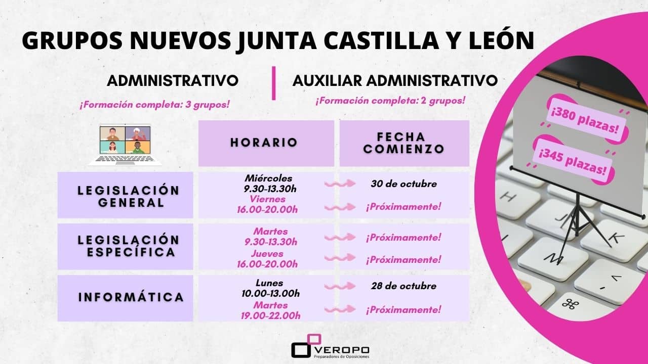 Abrimos más grupos nuevos ante la Convocatoria de 380 plazas como Auxiliar Administrativo y 345 plazas como Administrativo ¡No te quedes sin tu plaza!  ¡Lleno absoluto en los grupos que comienzan la semana que viene en Veropo para Auxiliar Administrativo JCYL! Así que…¡Abrimos más ante la gran demanda que hemos recibido! Desde que salió la…