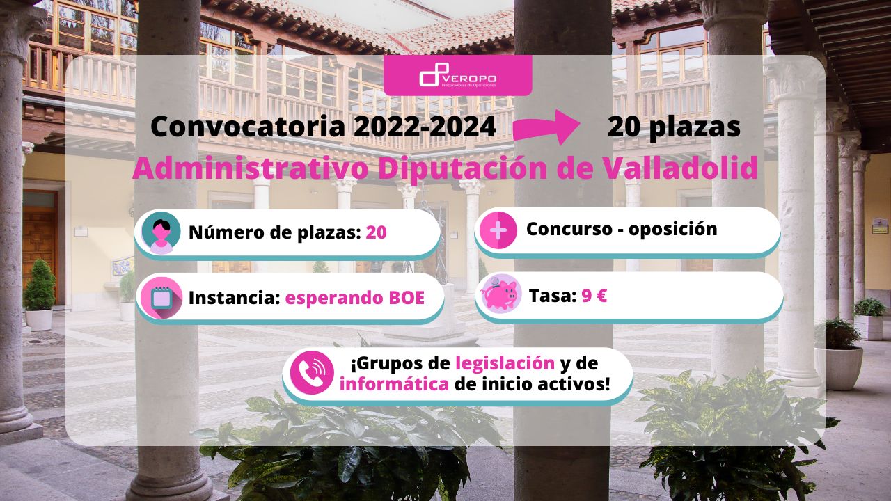 La Diputación de Valladolid convoca 20 plazas como Administrativo correspondientes a las Ofertas de Empleo de los años 2022 y 2024 Aprovechando que la Convocatoria pasa por Valladolid…¿o era el Pisuerga? Lo que está claro es que ha llegado un momento clave para todos/as los/as opositores que amáis Valladolid. Y es que la Diputación ha…