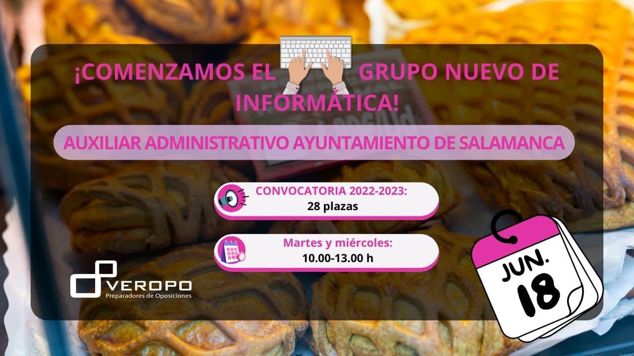 El martes 18 de junio comienza el grupo de informática para preparar las 28 plazas convocadas como Auxiliar Administrativo del Ayuntamiento de Salamanca ¡No pierdas la oportunidad! ¡Este mes ha sido intenso! Y es que desde que salió la Convocatoria de 28 plazas de Auxiliar Administrativo en el Ayuntamiento de Salamanca comenzamos a recibir peticiones…