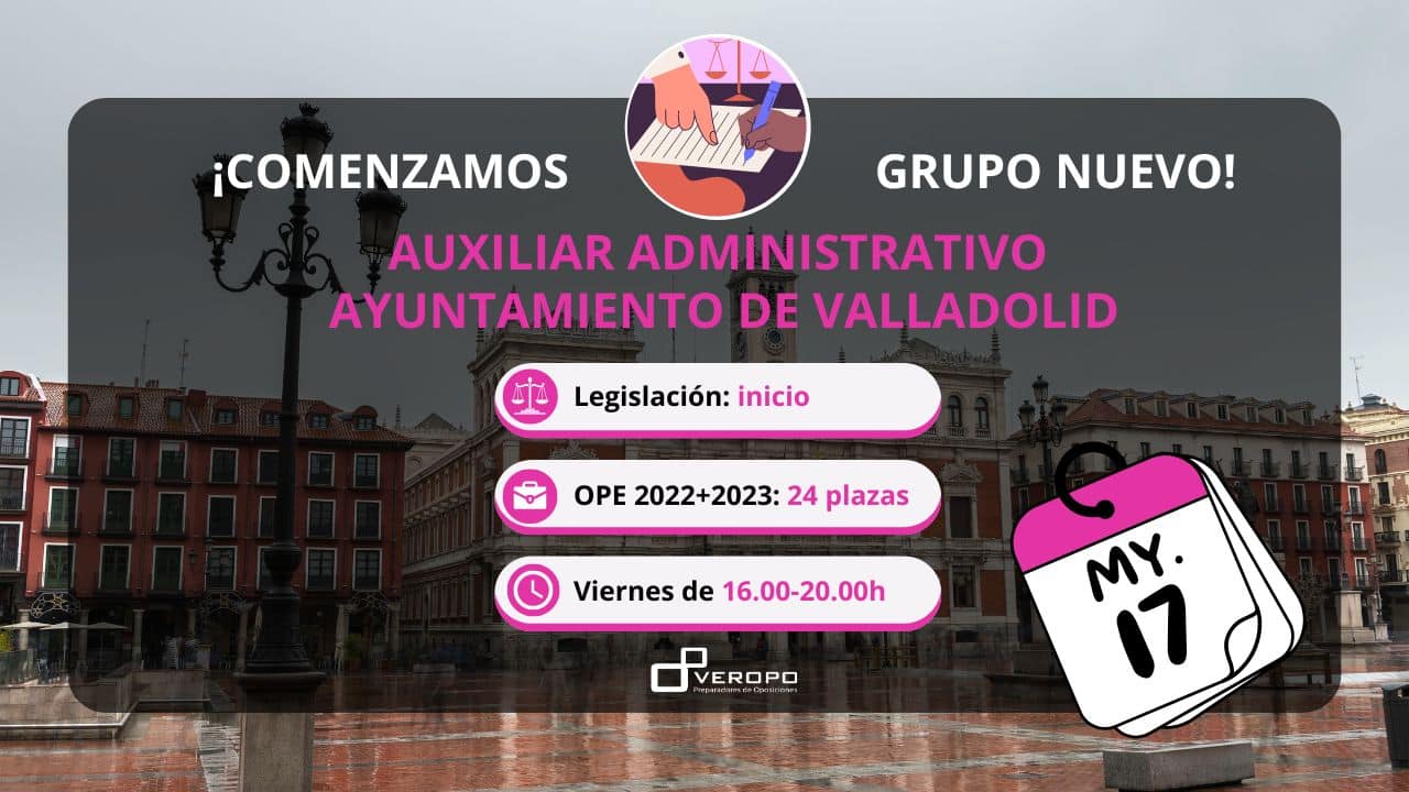 El viernes 17 de mayo comenzamos grupo para preparar la parte de legislación de Auxiliar Administrativo del Ayuntamiento de Valladolid ¡Vamos a por las 24 plazas! ¡Qué importante es labrar tu futuro en tu ciudad, en tu Valladolid! Sabemos que para ti es vital permanecer aquí por lo que preparar la oposición de Auxiliar Administrativo…