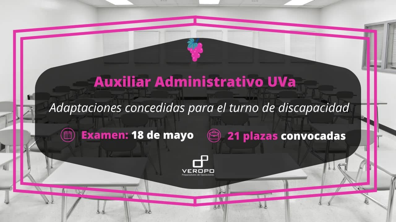 La UVa publica las adaptaciones concedidas a los aspirantes del turno de discapacidad para el examen del 18 de mayo de Auxiliar Administrativo  ¿Vas a ir al examen el próximo 18 de mayo de Auxiliar Administrativo en la UVa? ¡Pues tenemos novedades! Y es que el Tribunal calificador del proceso selectivo ha publicado las adaptaciones…