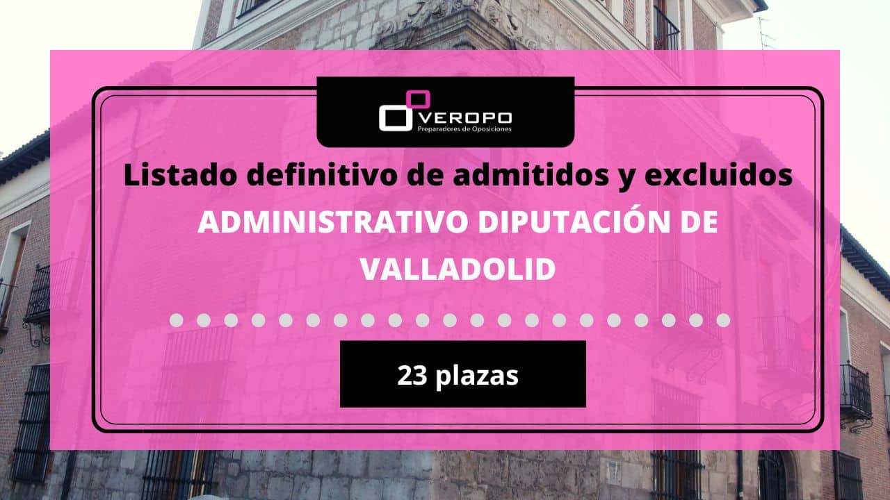 La Diputación de Valladolid hace público el listado definitivo con los aspirantes admitidos y excluidos para optar a las 23 plazas convocadas de Administrativo Ya tenemos el listado definitivo de aspirantes admitidos y excluidos para participar en el proceso selectivo que derivará en las 23 plazas que fueron convocadas para el cuerpo de Administrativo de…