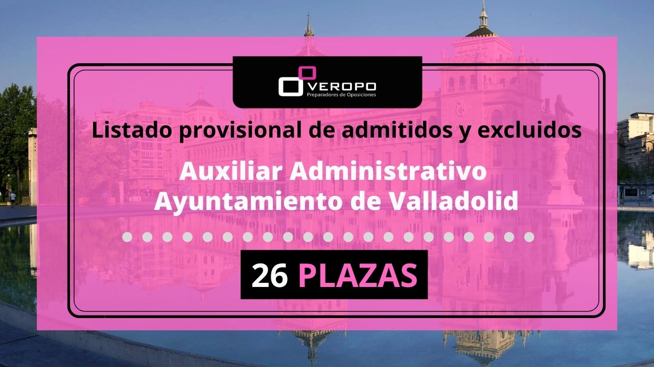 El Ayuntamiento de Valladolid publica el listado provisional de admitidos y excluidos para las 26 plazas convocadas de Auxiliar Administrativo  Ya tenemos lo que estabas esperando: ¡El listado provisional de admitidos y excluidos! El Ayuntamiento de Valladolid ha publicado una resolución con el listado de admitidos y excluidos para el proceso selectivo Auxiliar Administrativo del…