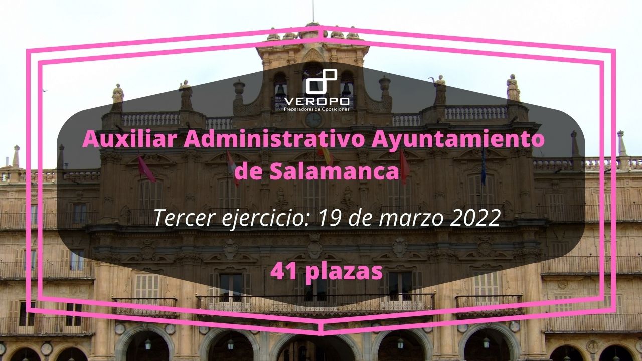 El Ayuntamiento de Salamanca fija la fecha del tercer ejercicio para la Convocatoria de 41 plazas de Auxiliar Administrativo ¡El proceso va viento en popa! Ya conocemos la fecha del tercer ejercicio de Auxiliar Administrativo del Ayuntamiento de Salamanca. Si superaste el segundo ejercicio celebrado el pasado 17 de diciembre…¡Toma nota! El tercer examen tendrá lugar…