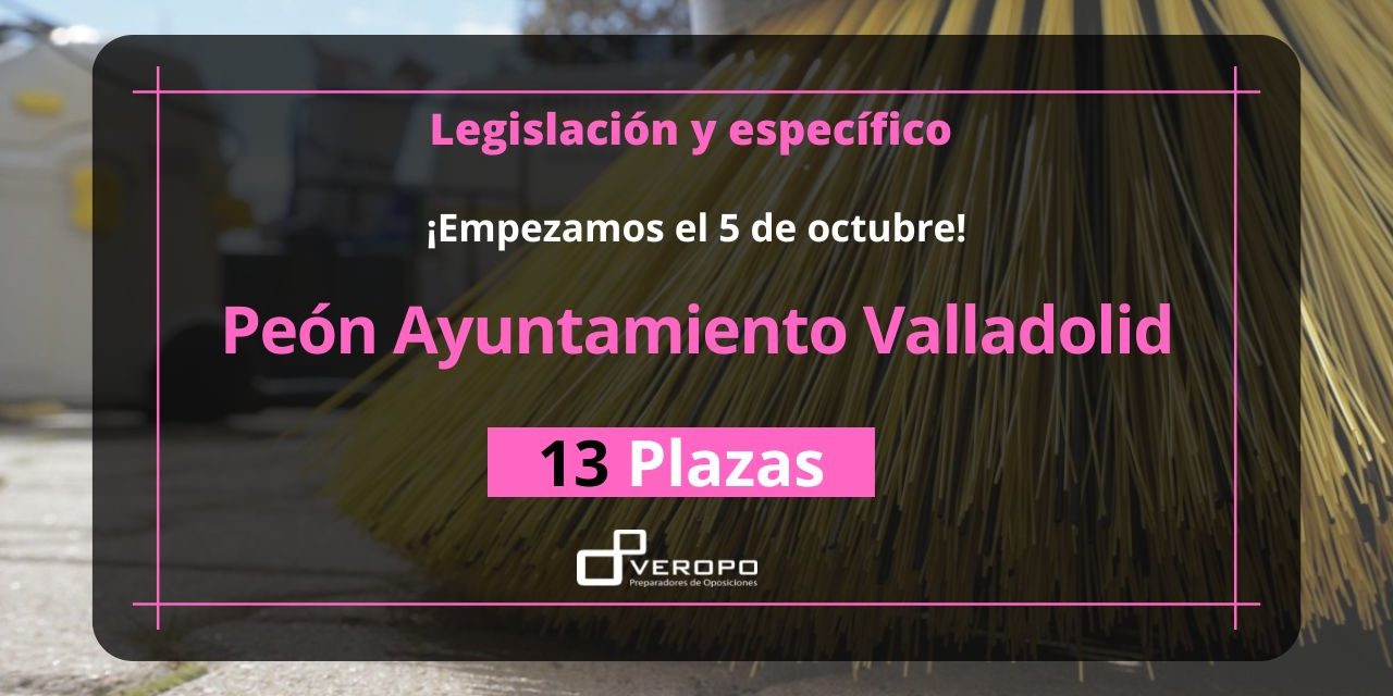 ¡Abrimos grupo! El próximo 5 de octubre comenzamos con la preparación para lograr plaza como Peón del Ayuntamiento de Valladolid. En Veropo tenemos dos modalidades para seguir la formación: presencial o a distancia. Tanto en una modalidad como en la otra, la clase es la misma y dispondrás de ella grabada durante una semana, desde el día siguiente de la clase hasta que se sube la siguiente clase. Así podrás volver a volverla las veces que necesites y cuándo necesites.