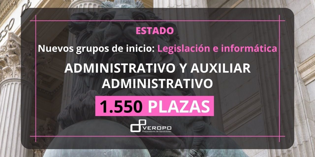 1.550 son las plazas que suman las pendientes de Convocatoria de Auxiliar Administrativo de Estado y Administrativo Estado. Concretamente, son 550 las ofertadas de Auxiliar y 1.000 las de Administrativo. En Veropo te lo ponemos fácil y queremos ayudarte a prepararte para lograr tu plaza. Ahora es el momento ideal al contar con la OPE 2021 ya que hay plazo para poder prepararlas así que ¡No lo dudes! Tenemos grupos para preparar la legislación y la informática de Estado y puedes reservar tu plaza desde ya para comenzar con ello. ¡Muy atento y no pierdas detalle!