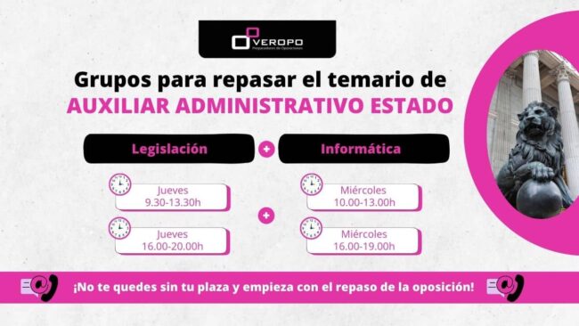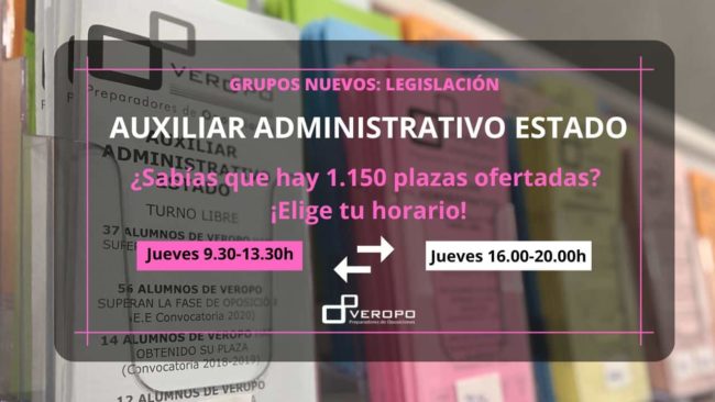 Abrimos nuevo grupo para preparar la legislación de Auxiliar Administrativo del Estado ¡Hay 1.000 plazas ofertadas! Puedes conseguir una plaza como Auxiliar Administrativo del Estado. Esto es una realidad tan real como que en Veropo vamos a abrir un nuevo grupo para preparar la legislación de Auxiliar Administrativo del Estado desde el inicio para que…