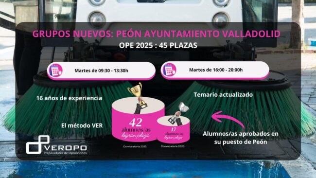 ¡Aprovecha y únete a los grupos de Peón en el Ayuntamiento de Valladolid! ¡Últimas plazas disponibles a distancia!  ¡Vaya oportunidad! Con 45 plazas ofertadas como Peón en el Ayuntamiento de Valladolid, Veropo se ha llenado de opositores y opositoras que tienen claro que quieren su plaza en su ciudad. Y es que tenemos dos grupos…