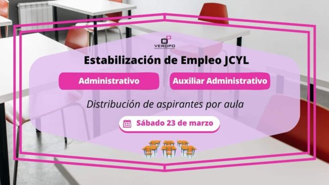 La JCYL publica la distribución de aspirantes por aula para el examen de Estabilización de Empleo de Administrativo y Auxiliar del próximo sábado 23 de marzo ¡Últimas puntadas en los procesos de Administrativo y Auxiliar Administrativo JCYL por Estabilización de Empleo! Ya os contamos la semana pasada que ya conocíamos la esperada fecha, y es…