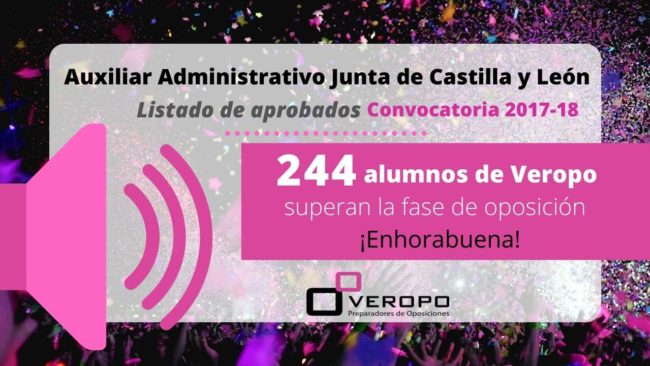 Un total de 244 alumnos de Veropo superan la fase de oposición de Auxiliar Administrativo JCYL Se escribe viernes y se pronuncia…¡al fin tenemos los resultados de Auxiliar Administrativo JCYL! Y es que hoy la Junta de Castilla y León llena el fin de semana con noticias para todos publicando tanto el listado de aprobados…