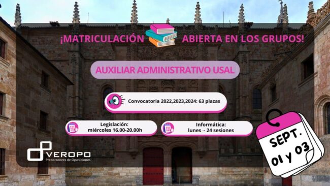 ¡Abrimos grupos en septiembre para comenzar la legislación y la informática de la Convocatoria de 63 plazas como Auxiliar Administrativo USAL!  ¿Quién quiere una de las 63 plazas convocadas como Auxiliar Administrativo en la USAL? Nada más supimos sobre esta gran Convocatoria, en Veropo nos pusimos manos a la obra para prepararla en su totalidad.…