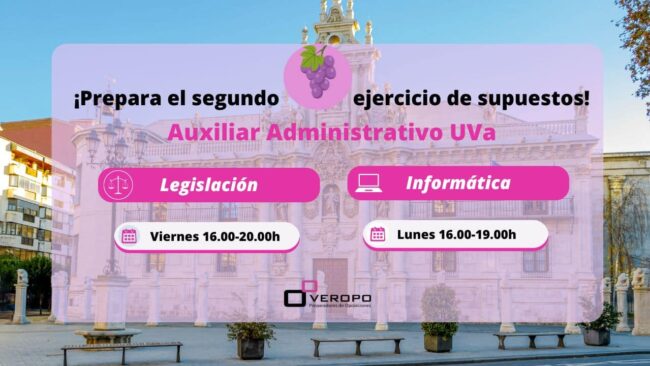 Grupos de repaso tanto de legislación como de informática de Auxiliar Administrativo UVa para preparar el segundo ejercicio de supuestos ¡Todo en marcha para el segundo examen de Auxiliar Administrativo de la UVa en Veropo! Y es que tenemos dos grupos de repaso tanto de legislación como de informática enfocados a dominar el segundo examen…