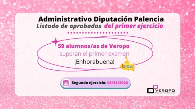 La Diputación de Palencia publica el listado de aprobados del primer ejercicio de Administrativo y fija la fecha del segundo examen para el jueves 5 de diciembre  ¡Ya tenemos novedades! Y es que ayer la Diputación de Palencia publicó el listado de aprobados del primer ejercicio de Administrativo. En Veropo estamos de enhorabuena, ya que…