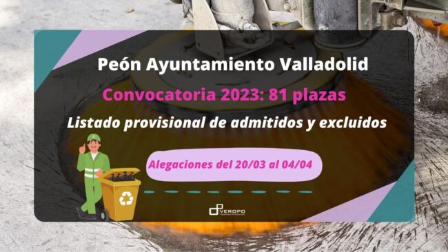 El Ayuntamiento de Valladolid publica los listados de admitidos y excluidos para el proceso selectivo de 81 plazas de Peón ¡Peones y peonas, empieza el movimiento! Y es que el Ayuntamiento de Valladolid ha publicado el listado provisional de admitidos y excluidos del proceso selectivo de 81 plazas. ¿Qué debes hacer ahora? ¡Mira el listado…